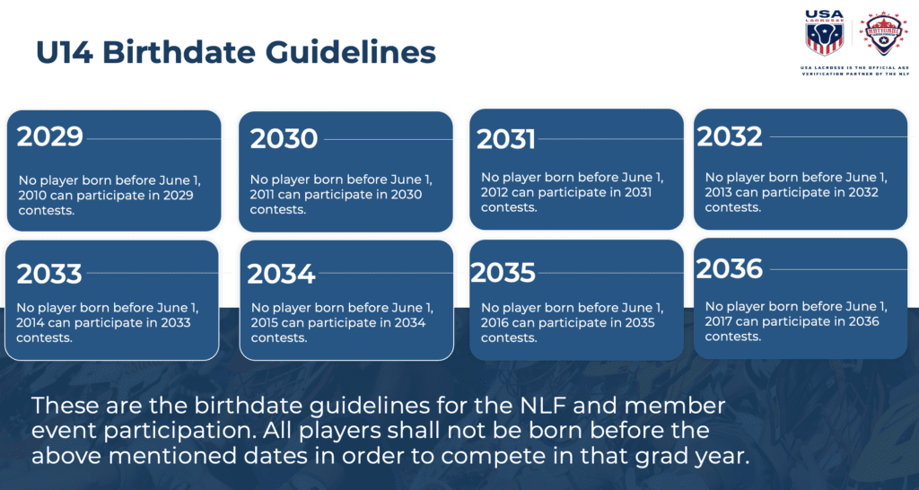 in 2023, the National Lacrosse Federation (NLF) and USA Lacrosse announced that they have entered into a transformational partnership that will bring age verification to the boys’ club lacrosse landscape. As a Team 91 South player you are thereby a participating player within NLF events which will be require all players to play under these new rulings..